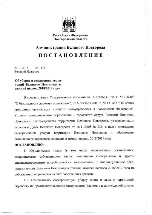 Постановление № 4731 24.10.2018 Об уборке и содержании территорий Великого Новгорода в зимний период 2018/2019 года Опубликован: 01.11.2018