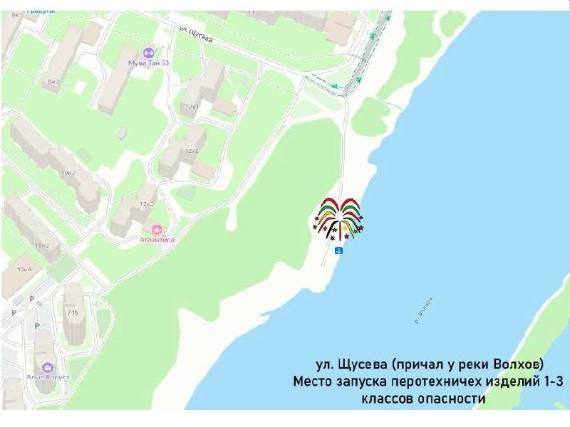 - улица Щусева - причал у реки Волхов (координаты: 58.562974, 31.290822);