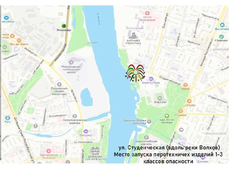 - Студенческая улица, у отеля Береста Парк Отель - набережная реки Волхов (координаты: 58.537657, 31.288463).
