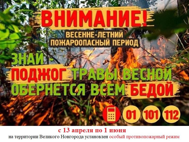 Напоминаем, Постановлением Администрации Великого Новгорода от 13.04.2026 № 1336 «Об установлении на территории Великого Новгорода особого противопожарного режима», на территории Великого Новгорода с 13 апреля по 1 июня 2026 года установлен особый противопожарный режим.